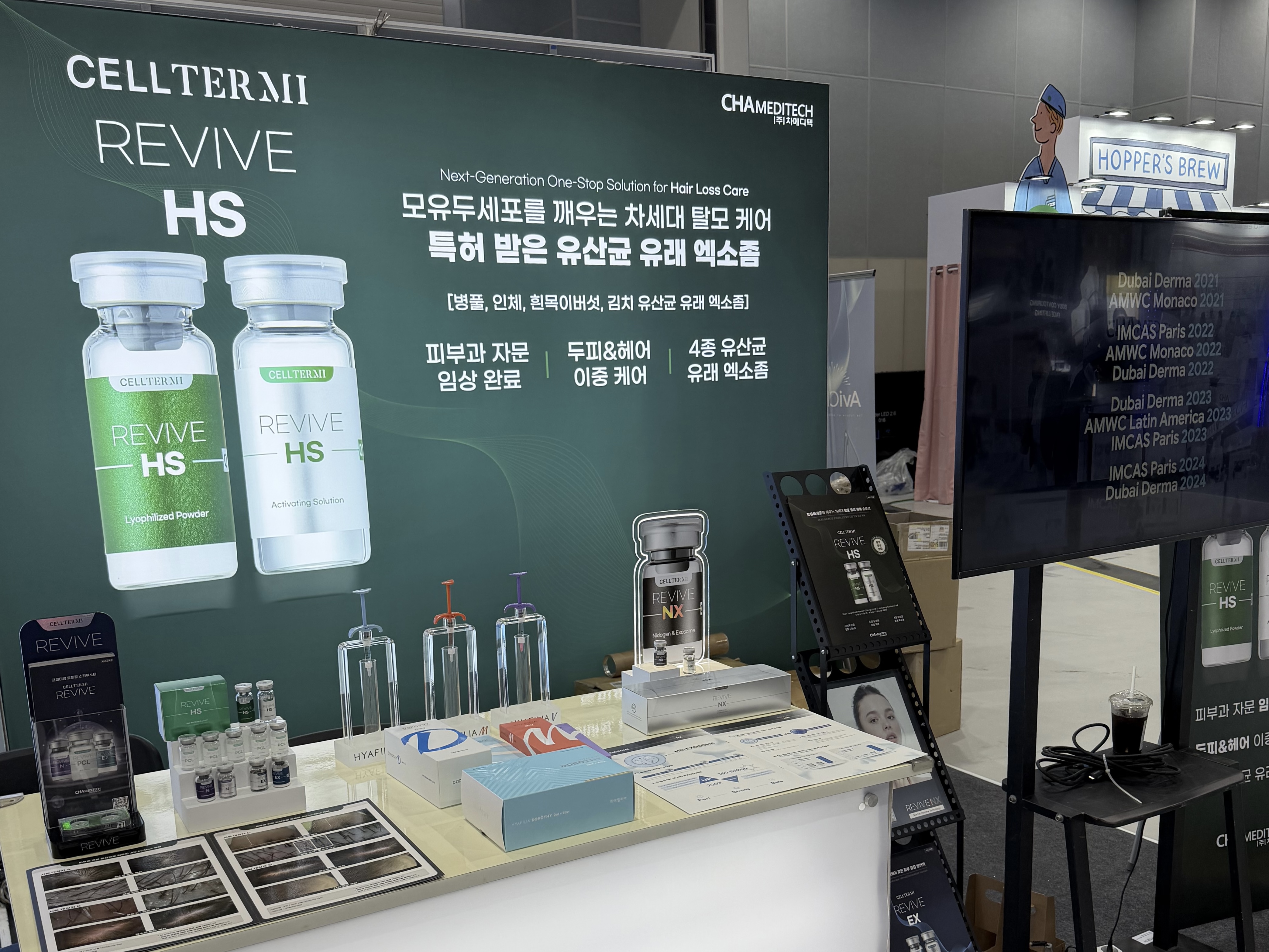 At booth A63 on the first floor, CHAMEDITECH staffs showcased the all-in-one hair booster CELLTERMI REVIVE HS, the instant-hydrating skin booster DORTOHY, the premium skin booster series CELLTERMI REVIVE, and the HYAFILIA series of HA fillers. Buyers from around the world reportedly showed interest in CHAMEDITECH's proprietary probiotic-derived EV ingredients and PCL skin boosters.